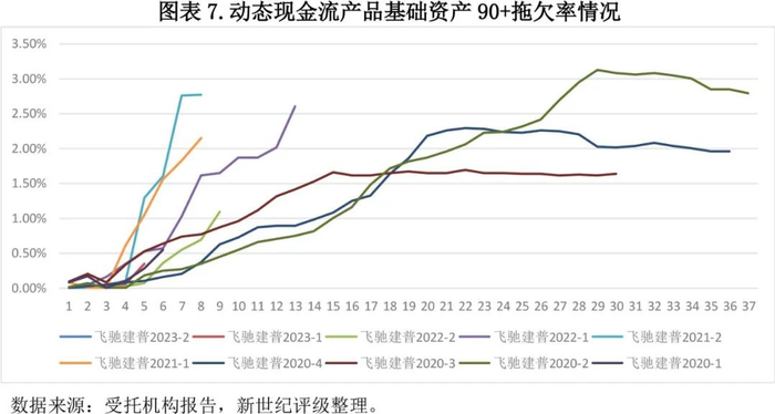 在10个表现期后,大部分动态现金流产品90+拖欠率超过0.50%,在15个表现期后“飞驰建普”系列产品90+拖欠率在1.00%-3.50%之间。