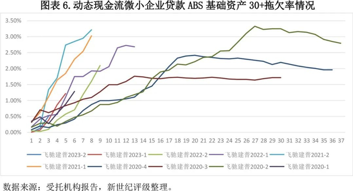 考虑到数据的可获得性,本文仅对截至2023年末已披露受托机构报告且表现期在3期及以上的银行间市场发行的微小企业贷款ABS存续期表现情况进行分析。我们依据交易结构中是否涉及基础资产的循环购买将产品分为静态现金流和动态现金流。对于静态现金流产品,通过观测其累计31-60天拖欠率[1]来进行分析。对于动态现金流产品,通过观测其30+拖欠率[2]和90+拖欠率[3]来进行分析。