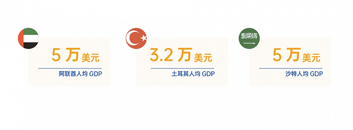 根据IMF 2023年数据,阿联酋的人均GDP为5万美元,沙特为3.2万美元,均属于高收入富裕国家。土耳其的人均GDP为1.3万美元,也高于世界平均水平与中国。