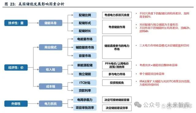 技术性+经济性双重驱动,电网升级+并网审批法案改革强刺激,美国储能发展 有望提速。复盘美国储能的发展,2022年受供应链紧张影响,美国储能新增装机有 所放缓,但新能源装机规模的高增长、极端天气对电力系统稳定性的较大冲击以及 IRA法案对ITC补贴政策的延续使得美国储能景气需求延续。2023年在供应链压力大 幅缓解的背景下,美国储能装机规模预计呈现翻倍增长,但仍受包括贷款利率、审 批效率、电网承载力等因素钳制。综合影响美国储能发展的各项因素,我们认为, 美国储能的规模与进程主要受技术性与经济性两个维度影响。技术性决定美国储能 的配储形式、配储比例与配储时长,不同消纳压力对应储能差异化需求;经济性决 定配储意愿,包括储能收益模式、ITC补贴、项目贷款利率等,结合外部电网容量、 审批效率等因素,综合决定美国储能发展规模与发展速度。