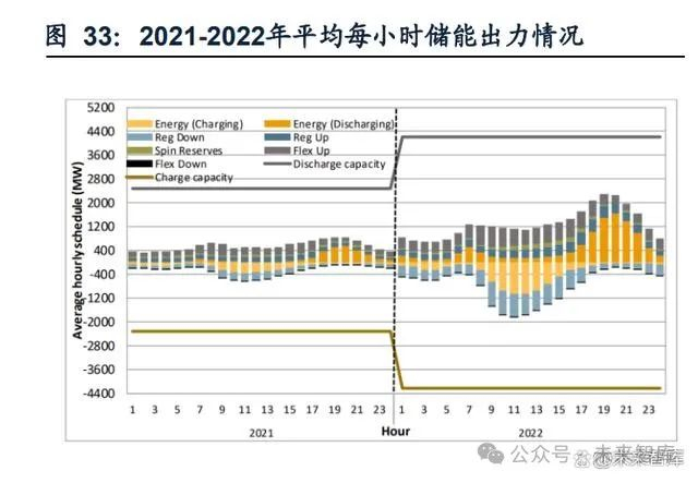 美国独立储能主要参与电能量市场、辅助服务市场和容量充裕度市场,其中电 能量市场与辅助服务市场贡献主要收入。根据CAISO统计的2021年与2022年加州储 能资源平均每小时出力情况,从功率角度看,2020年及以前独立形态的储能主要应 用于提供辅助服务,包括调频、备用、爬坡等,而2021年以来随着电能量市场价差 的扩大,储能提供的电能量增长超过辅助服务出力增长,在需求高峰时段储能平均 放电功率甚至达到其输出功率的73%。从收入角度看,独立储能最大的收入来自日 前电能量市场,其次为指令性不平衡市场与调频市场。我们认为,新能源装机规模 的快速增长为加州电力系统带来同样的挑战,电力净负荷曲线在新能源出力高峰时 段持续下探,净负荷变化得“更深”与“更陡”一方面电能量市场峰谷价差拉大为 储能参与电能量市场提供更高收益,另一方面辅助服务市场调节需求明显提升,储 能参与辅助服务市场频率加大,两大市场贡献独立储能主要收入。
