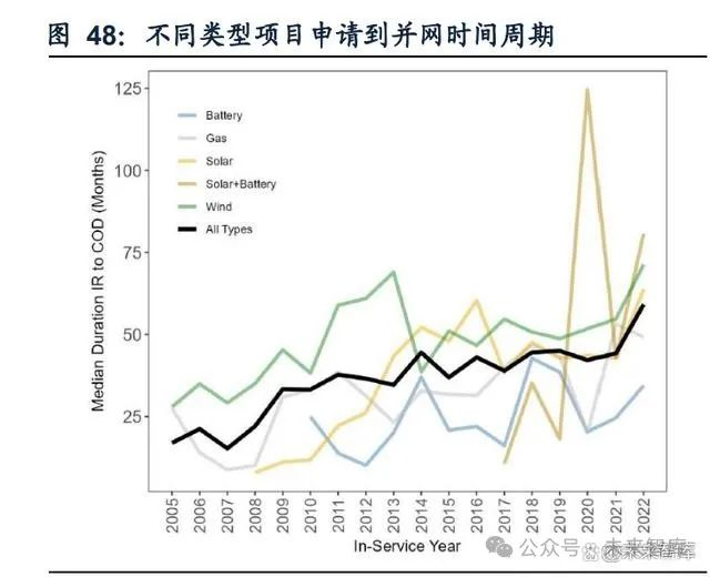 并网周期拉长,大储项目推迟并网频发,美国大能项目从申请到并网的平均周 期已达3年。2023年美国储能延后并网现象频繁,根据Wood Mackenzie Q1报告统计,约1.8GW计划在2022Q4并网但被延迟到2023Q1的大储项目中超80%(1.4GW) 被再度推迟至2023Q2,而Q2依旧有1.7GW的大储项目被延后至下半年,大储的并 网延迟已成为常态。 除储能外,各类型能源并网延迟以成为常态,根据劳伦斯伯克利国家实验室数 据,近年来各类型发电机组审批时间均有所延长,美国各类型发电项目从递交并网 申请(Interconnection Request,简称IR)至商业运营(Commercial Operations Date, 简称COD)的平均时长由2015年的35个月提升至2022年的57个月,相比之下储能 项目的建设周期短于平均时间,但同样受申请规模大幅增长影响审批周期提升,审 批周期从2015年的19个月提升至2022年的35个月。分项目规模看,规模与申请周 期呈正相关,规模小于5MW的发电项目申请时间略长于20个月,超过200MW的大 项目则接近60个月。