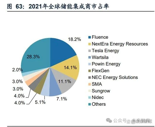 头部大储集成商与大型项目开发商深度绑定,先发优势显著,市场份额持续拓 张。根据IHS Markit数据,2021年按已装机与计划装机容量之和排序的全球储能集 成商CR4、CR10达50%、72%,其中Fluence、NextEra Energy Resources、特斯 拉凭借多年可再生能源开发经验切入集成制造环节,市场份额稳居前三。根据Wood Mackenzie数据,2022年北美前三大集成商分别为特斯拉、Fluence、阳光电源,市 场份额分别为23%、22%、13%,头部集成商份额进一步提升。 分析主要集成商企业,Fluence为西门子与美国最大的独立供电商AES合资成 立的专注于储能业务的子公司,稳居全球储能系统集成商龙头,储能累积规模超过 7GW。NextEra Energy Resources为美国最大的可再生能源开发商与大型储能设 备提供商,项目资源优势显著。特斯拉作为全球领先的电动汽车和能源公司,通过 产业链一体化,为客户提供集硬件设备、软件运营策略于一体的整体解决方案,2023 年上半年储能系统全球交付超7.5GWh(Q1、Q2分别为3.89GWh、3.65GWh)。 根据特斯拉官网价格,目前1套1.9MW/3.9MWh的Megapack售价267万美元、单价 约人民币4.70元/Wh,在碳酸锂降价的背景下上半年涨价4%。进一步彰显品牌与技 术溢价。阳光电源作为国内储能集成龙头企业,凭借国内供应链成本优势与液冷产 品性能优势不断开拓海外市场,市场认可度持续提升。