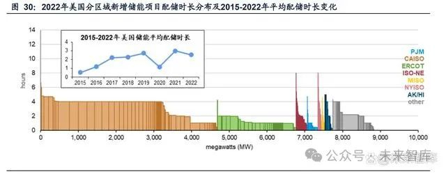 配储时长:光伏需配置4小时储能,更长时储能需求渐起。根据EIA数据, 2018-2022年美国表前储能平均配储时长为2.28、2.74、1.17、2.98、2.54h,2022 年受部分大型储能项目并网延期影响平均配储时长有所降低,但整体仍高于中国 2.1h的平均配储时长(GGII统计,2022年)。分区域看,光伏装机容量最大的加州 大部分部署的电池储能系统持续放电时间达4小时以上,平均配储时长显著高于其他 地区。2023年3月美国能源部宣布与合作伙伴签署谅解备忘录以加速长时储能的商 业化,并制定了长时储能计划,旨在十年内将电网规模储能系统的成本降低90%, 持续时间提高至10小时以上。未来随着美国新能源渗透率的提升,配储时长有望持 续提升。