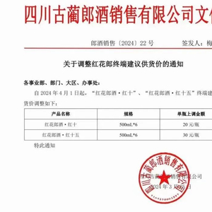 2024年3月25日,郎酒销售公司发布关于调整红花郎终端建议供货价的通知。通知显示,自4月1日起,红花郎酒·红十(500mL*6)单瓶价格上调20元、红花郎酒·红十五(500mL*6)单瓶价格上调30元。