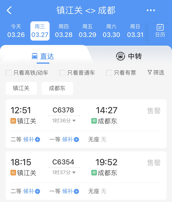 成都东站 ⇋ 镇江关站动车时刻表
