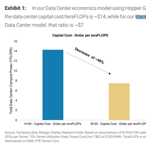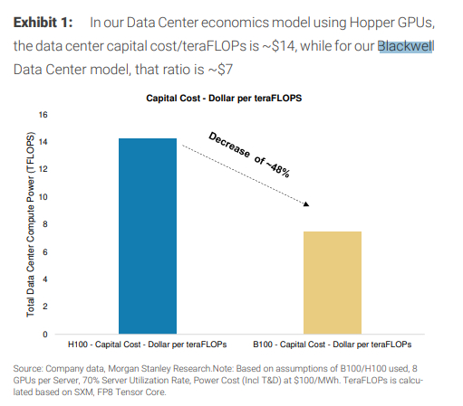 数据中心模型显示,使用Hopper GPU的数据中心每teraFLOPs(每秒万亿次浮点运算)资本成本为14.26美元,而Blackwell数据中心的成本为7.48美元,这意味着当从Hopper GPU升级到Blackwell GPU时,资本成本每teraFLOPs下降约50%。