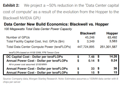 大摩指出,随着GPU效率的提高,数据中心算力成本正在迅速下降,以英伟达最新发布的Blackwell为例,只占到hopper能耗的一半,具体来看: