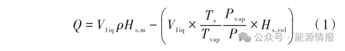 式中:Q为总热值,MJ;V1iq为LNG液体体积,m3;Hs,m是LNG的质量总热值,MJ/kg;Ts是标准参考温度,288.15K;Tvap是储罐气相空间温度,K;Pvap为储罐气相空间压力,kPa;Ps是标准参考压力,101.325kPa;Hs,vol是气体体积热值,MJ/m3。