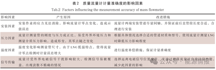 科里奥利质量流量计是通过测量科里奥利力来直接测量质量流量的方法,可直接测得LNG的交接质量。在LNG计量过程中影响质量流量计计量准确度的因素如表2所示。