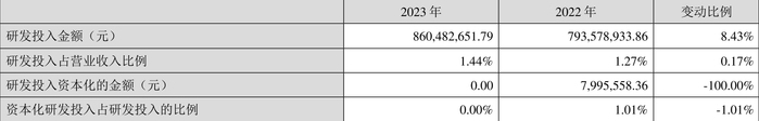 2023年全年,公司研发投入金额为8.60亿元,同比增长8.43%;研发投入占营业收入比例为1.44%,相比上年同期上升0.17个百分点。此外,公司全年研发投入资本化率为0。