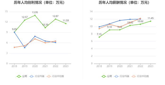 截至2023年末,公司员工总数为43605人,人均创收137.82万元,人均创利11.59万元,人均薪酬11.45万元,较上年同期分别变化-4.06%、-9.98%、7.78%。