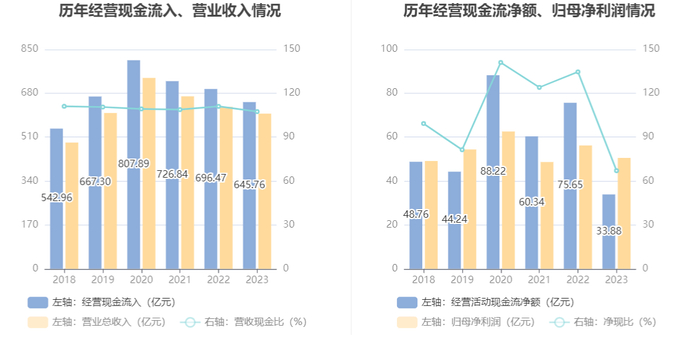 2023年,公司经营活动现金流净额为33.88亿元,同比下降55.22%;筹资活动现金流净额-31.46亿元,同比增加32.69亿元;投资活动现金流净额-31.78亿元,上年同期为-34.88亿元。