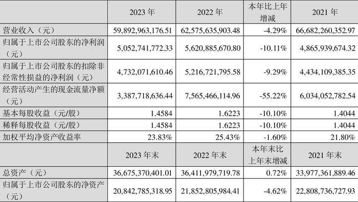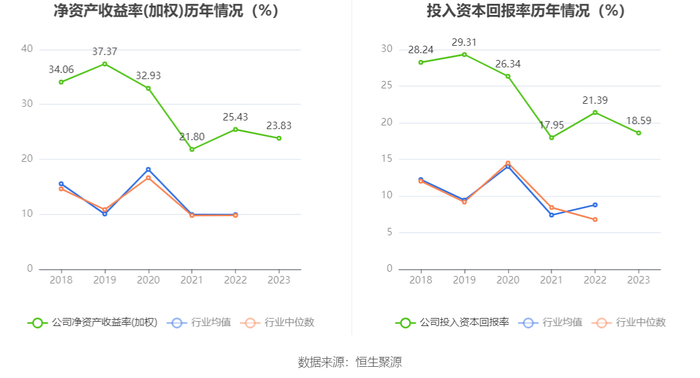 数据显示,2023年公司加权平均净资产收益率为23.83%,较上年同期下降1.60个百分点;公司2023年投入资本回报率为18.59%,较上年同期下降2.80个百分点。
