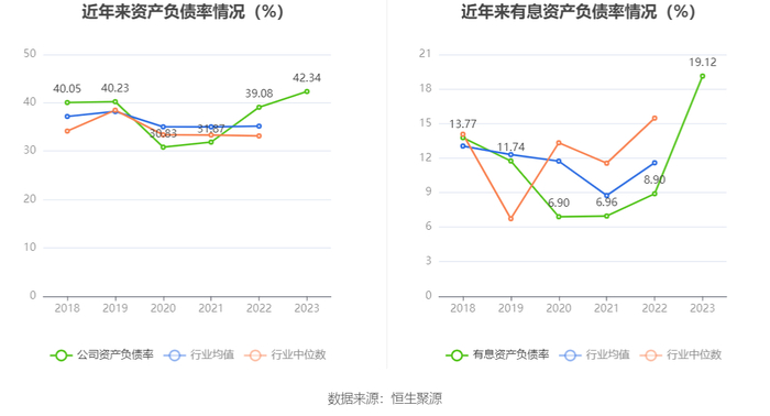 在偿债能力方面,公司2023年年末资产负债率为42.34%,相比上年末上升3.26个百分点;有息资产负债率为19.12%,相比上年末上升10.22个百分点。