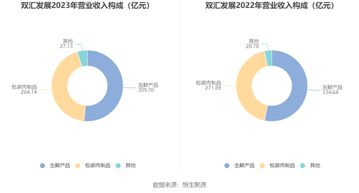分产品来看,2023年公司主营业务中,生鲜产品收入309.70亿元,同比下降7.45%,占营业收入的51.53%;包装肉制品收入264.14亿元,同比下降2.85%,占营业收入的43.95%。