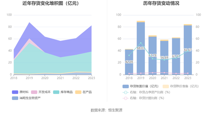从存货变动来看,截至2023年年末,公司存货账面价值为82.67亿元,占净资产的39.66%,较上年末增加21.45亿元。其中,存货跌价准备为2.08亿元,计提比例为2.46%。