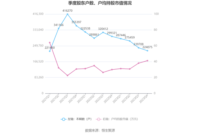 筹码集中度方面,截至2023年年末,公司股东总户数为22.41万户,较三季度末下降了1.56万户,降幅6.52%;户均持股市值由三季度末的38.14万元上升至41.30万元,增幅为8.29%。