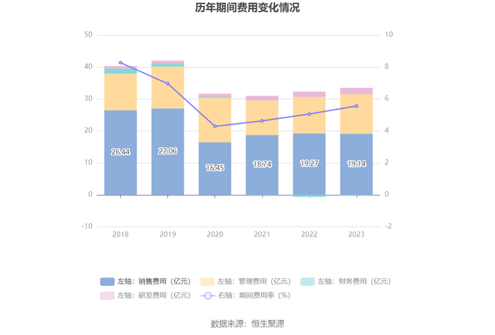 2023年,公司期间费用为33.33亿元,较上年同期增加1.64亿元;期间费用率为5.56%,较上年同期上升0.50个百分点。其中,销售费用同比下降0.69%,管理费用同比增长8.83%,研发费用同比增长18.27%,财务费用由去年同期的-6058.50万元变为-1474.25万元。
