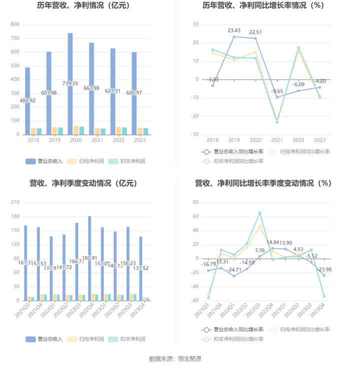 2023年,公司毛利率为17.05%,同比上升0.66个百分点;净利率为8.52%,较上年同期下降0.62个百分点。从单季度指标来看,2023年第四季度公司毛利率为14.96%,同比上升0.24个百分点,环比下降3.44个百分点;净利率为5.25%,较上年同期下降3.57个百分点,较上一季度下降4.33个百分点。