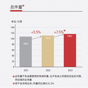 2023年,顺丰控股聚焦可持续发展,不断调优产品结构,追求高质量业务和收入增长,其中,速运物流板块收入达到1911亿元,同比增长9.7%,速运业务件量合计达到119.7亿票,同比增长7.5%。2023年6月,顺丰控股出售了加盟网络丰网,不含丰网业务,速运业务收入同比增长11.3%,件量同比增长16.2%。