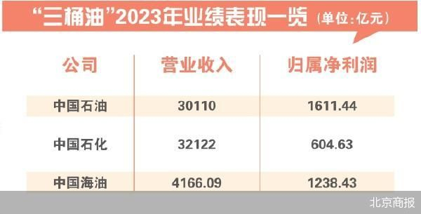 经同花顺iFinD统计,中国石油、中国石化2023年营收均在3万亿元以上,分别约为3.01万亿元、3.21万亿元;中国海油营收偏低,约为4166.09亿元。