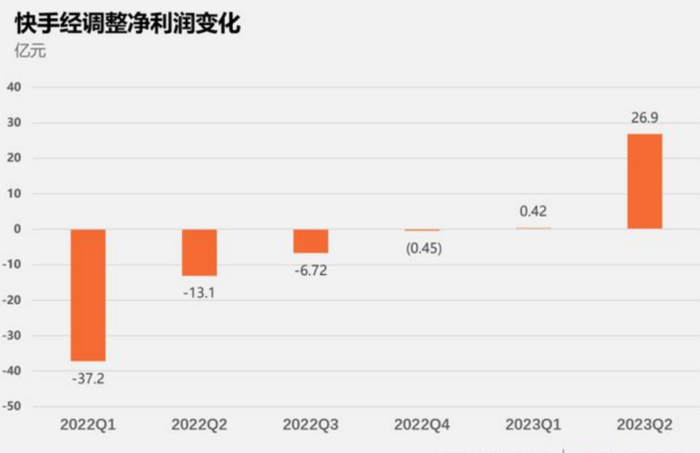 其实快手扭亏为盈在2023年上半年就已经实现,2023年Q1,快手经调整净利润为0.42亿元,第二季度则大涨至26.9亿元,环比暴涨63倍,逐步展现出明显的利润扩张趋势。
