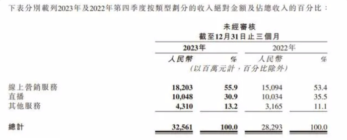 2023年年报显示,广告和电商仍是快手营收的主要构成。2023年快手广告收入同比增长23%至603亿元;直播业务板块由2022年的354亿元增长至391亿元;快手其他服务板块收入则由2022年的98亿元增长44.7%至141亿元。线上营销服务、直播和其他服务在全年总营收的占比分别为53.1%、34.4%和12.5%。直播和其他服务的占比增长较为明显。