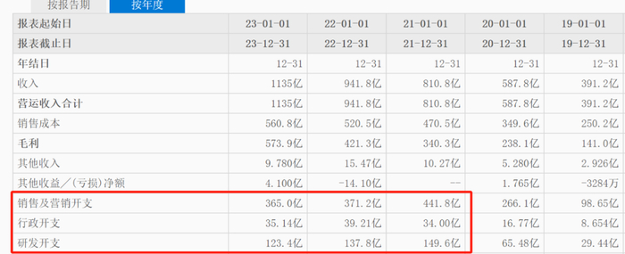 财报数据显示2023年,快手营销费用365亿元,同比2022年的371.2亿元只下滑了1.7%,即便相比2021年441.8亿元的营销费用,下滑幅度也只有17%。2023年行政费用为35.14亿元,同比2022年的39.21亿元下滑了10%,但依然高于2021年的34亿元。2023年的研发费用为123.4亿元,相比2022年137.8亿元下滑了10%,且近三年研发费用出现不断下滑趋势,但相比2020年的65.48亿元和2019年的29.44亿元依然有巨大的提升。