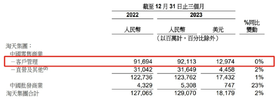 重振淘天集团被阿里内部视为最高优先级的任务之一。财报显示,2023年第四季度,作为阿里最核心的业务板块,淘天集团营收1290.70亿元,经调整EBITA为599.3亿元,同比仅录得个位数2%和1%的增长。刨去批发和直营业务,淘天最为重要的“客户管理”收入增速为零。也就是说,尽管去年第四季度有双11的加持,但淘天的增长依旧乏力。