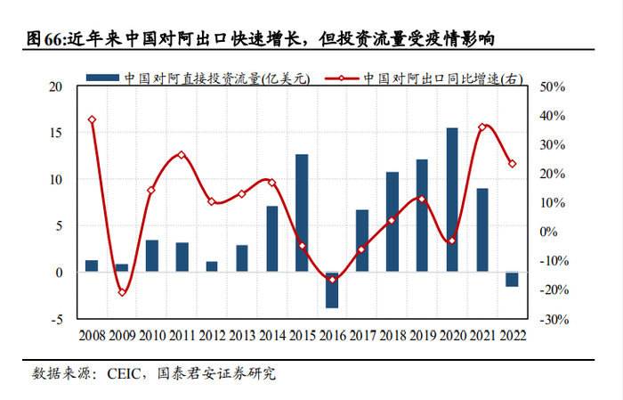 科技制造供需契合,中国对阿出口份额提升。中国是阿联酋第一大贸易伙伴,主要对其出口机电产品、纺织品、金属与化工品。近年来阿联酋基建需求旺盛并加大绿色转型,相关产品需求与中国产业优势十分契合。近年来中国对阿出口份额明显提升的品类包括汽车、电力设备与通信设备。