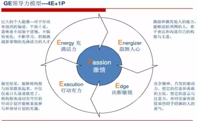 (三)行为。我们经常说领导要有领导的样儿,其实说的就是行为。做为工人,可以在背后发发牢骚,可以衣冠不整,一旦成为领导干部,就要做榜样,做表率。全球著名的GE的4E1P领导力模型如下: