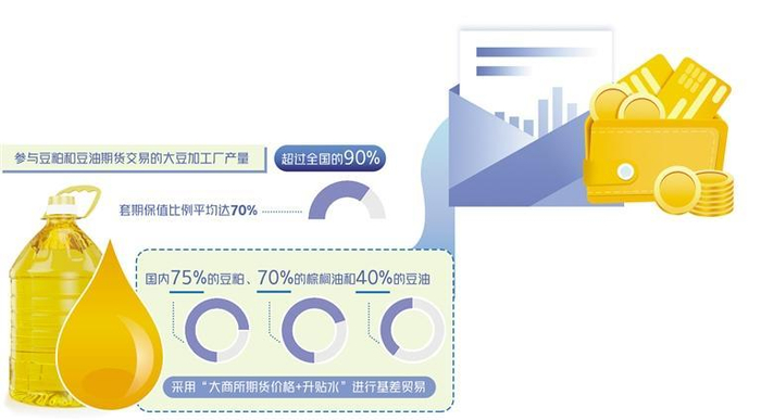 如今,大商所已成长为全球重要的大豆期货市场。参与豆粕和豆油期货交易的大豆加工厂产量超过全国的90%,套期保值比例平均达70%。国内75%的豆粕、70%的棕榈油和40%的豆油采用“大商所期货价格+升贴水”进行基差贸易,基差贸易逐渐发展为整个行业的普适模式。