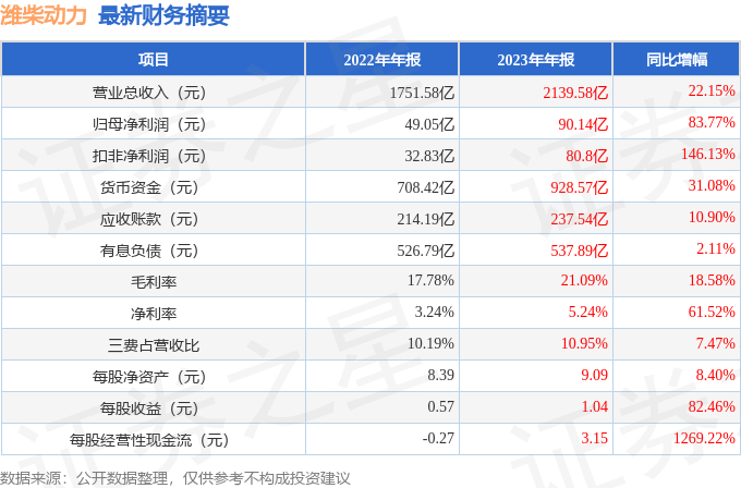 据证券之星公开数据整理,近期潍柴动力(000338)发布2023年年报。根据财报显示,本报告期中潍柴动力营收净利润同比双双增长,盈利能力上升。截至本报告期末,公司营业总收入2139.58亿元,同比上升22.15%,归母净利润90.14亿元,同比上升83.77%。按单季度数据看,第四季度营业总收入535.75亿元,同比上升20.03%,第四季度归母净利润25.13亿元,同比上升57.75%。