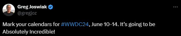 苹果全球营销高级副总裁格雷格·乔斯维克(Greg Joswiak)在社交媒体上写道,“在您的日历标记上WWDC24吧。这场活动无疑是很棒的!”