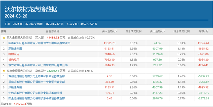除了作手新一以外,深股通专用席位当天也出现在沃尔核材龙虎榜买方前五位中,买入金额为9133.51万元,同时卖出4307.99万元;另有两个机构专用席位分列沃尔核材买方第三和第四位,合计净买入金额为1.28亿元。