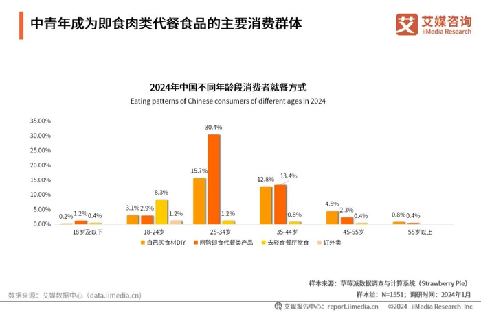 iiMedia Research(艾媒咨询)数据显示,从不同年龄段就餐方式看,年龄在25-34岁之间的人群为即食肉类的主要消费者,偏好网购即食代餐类产品,占比为30.4%,其次是35-44岁人群。艾媒咨询分析师认为,中青年群体可能面临更多的职业和家庭责任,导致时间不足,即食肉类产品提供了方便快捷的烹饪选择,符合其快节奏生活需求。中青年群体成为即食肉类产品的主要消费者是社会经济发展、家庭结构变迁和个体生活方式选择等多重因素的综合影响,即食肉类品牌可通过关注主要消费群体的消费方向及时调整产品战略。