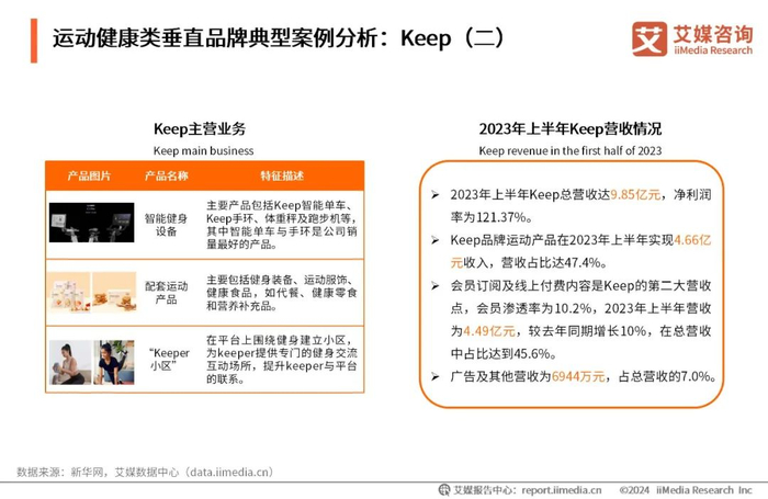 2023年上半年,Keep总营收达9.85亿元。在主营业务方面,Keep三条业务线相辅相成,形成一个协同的业务模式,覆盖用户的整个健身生命周期。Keep通过激励用户完成定期锻炼,提高用户参与度,并使用Keep全面的内容产品指导健身。Keep代餐、健康零食和营养补充品等配套运动产品拥有垂直的客户群体,客户忠诚度较高。