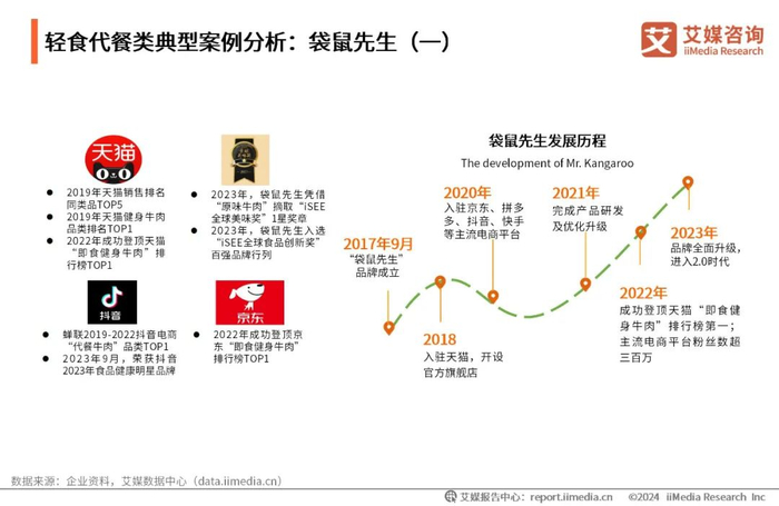 袋鼠先生于2017年成立,是专注于健康即食轻食的口碑品牌。袋鼠先生自研出高蛋白肉食系列、高纤烘焙、慢碳主食、冲饮和调味4大系列共三十余款产品,秉承着“袋袋好食材,健康超好吃”的产品理念,从食材源头进行严格把关,不断创新产品工艺,最大程度降低脂肪、蔗糖、食品添加剂等含量。2022年袋鼠先生成功登顶天猫“即食健身牛肉”排行榜第一,其主流电商平台粉丝数已超三百万。