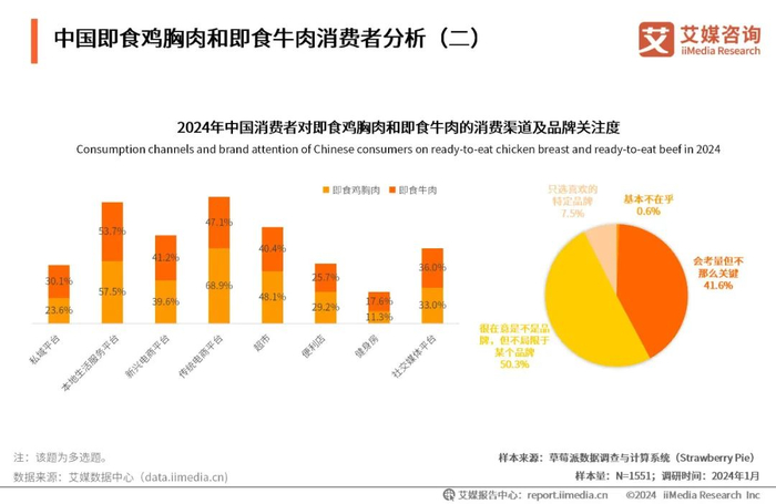 iiMedia Research(艾媒咨询)数据显示,多数消费者选择传统电商平台(如淘宝、京东)、本地生活服务平台(如美团、饿了么)、超市作为即食鸡胸肉的主要购买渠道,占比分别达68.9%、57.5%、48.1%;消费者主要选择本地生活服务平台和传统电商平台、新兴电商平台作为即食牛肉的购买渠道,占比分别达53.7%、47.1%、41.2%;50.3%消费者会考虑品牌因素,但是并不局限于某个品牌。