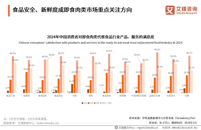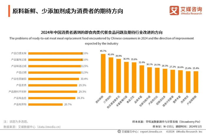 现如今,中国消费者对于即食肉类的要求持续提升。iiMedia Research(艾媒咨询)数据显示,30%以上的消费者遇到过即食肉类代餐食品口感太柴、腥味过重、味道过咸、过期、包装破损的情况;消费者表示对即食肉类代餐食品的原料新鲜(45.7%)、少添加剂(41.6%)、购买渠道更多元(39.9%)方面表示还有待提升。