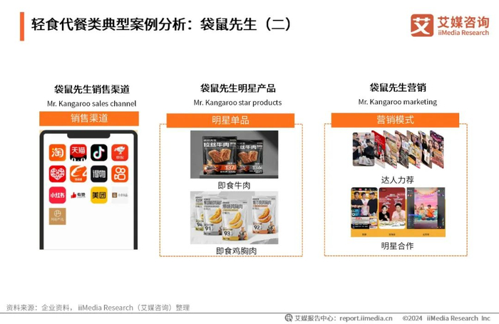 袋鼠先生通过淘宝、天猫、抖音、京东等主流电商平台及私域平台等多个渠道进行销售。品牌明星产品为即食牛肉和鸡胸肉,这两款产品都以配料简单、营养全面和美味可口等为特点。在营销方面,袋鼠先生与陈赫、胡海泉、吴宗宪等明星合作,并通过疯狂小杨哥、肥猪猪的日常、小贝饿了、密子君等网红达人等推荐,逐渐打通品牌数字营销之路。