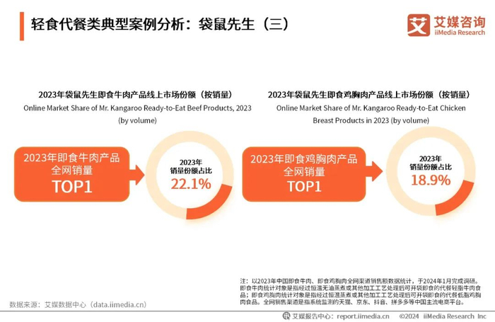 作为健康轻食领域口碑品牌,袋鼠先生在即食牛肉赛道已然成为头部,“牛肉+盐”的无添加剂配料表让其受到更多消费者追捧。2023年袋鼠先生即食牛肉产品全网销量位列第一,销量份额占比为22.1%。袋鼠先生鸡胸肉订单量较高,即食鸡胸肉产品全网销量排名第一;截至2024年1月,即食鸡胸肉累计销量已超过1.5亿袋。