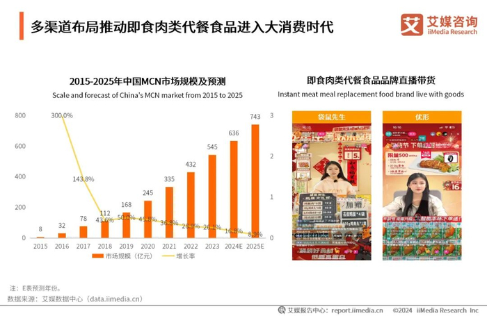 随着数字经济的蓬勃发展,新兴电商平台迅速崛起,其中以抖音为代表的兴趣电商发展成绩亮眼。iiMedia Research(艾媒咨询)数据显示,近年来中国MCN市场规模持续扩大,2023年市场规模达545亿元,预计2025年有望达743亿元。中国MCN市场扩大,直播电商作为新兴网红经济的新形式,为即食肉类行业开辟新的销售路径,多渠道布局将推动即食肉类代餐食品进入大消费时代。