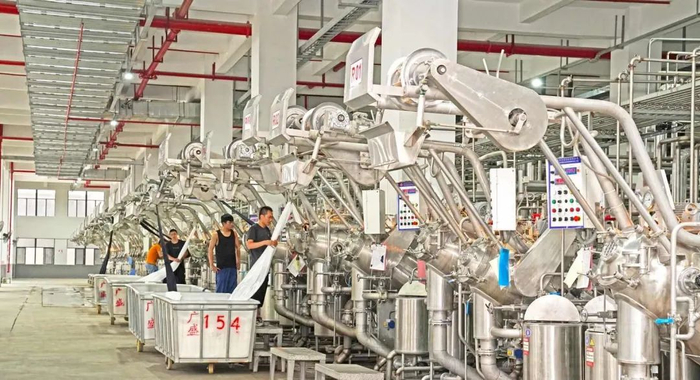 汕头市广盛制衣洗水有限公司主要从事经纬编锦氨、涤氨、锦涤氨混纺织物的染色及后整理加工生产,企业入驻印染园区后,引入拉幅定型机、超高速高温高压染布机等近百台先进设备,并通过全套计算机集成控制的ERP生产管理系统和MES系统、染色车间与定型车间的中央控制系统,提升工艺水平,提高印染产量和质量。该企业厂长张宜传边向记者展示全中控操作系统边介绍 ,设备更新换代后,染料助剂也能实现自动输送,这样一来就减少了人工参与度,不仅降低企业成本、提高生产效率,还显著提升了产品稳定性和良品率。