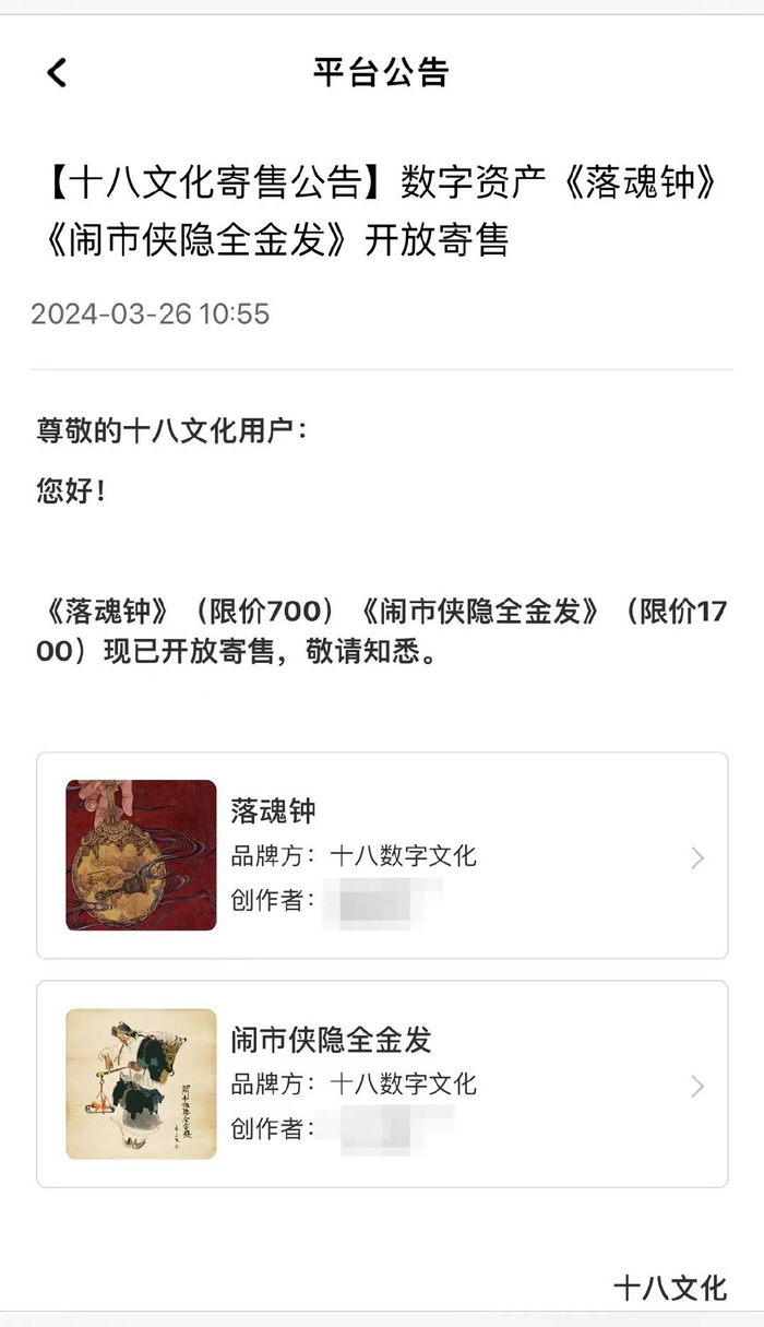 十八数藏的法务李某告诉红星新闻,平台主要做寄售区市场,首发市场的大部分藏品空投给用户,让用户在寄售区市场(二级市场)进行交易。寄售区藏品由用户自主定价,交易资金直接进用户账户,不进平台,“我们就收取一个手续费。”