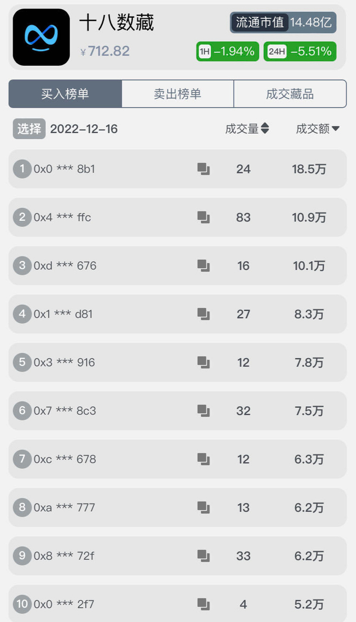 这种对半砍的玩法,张晖也察觉出了不对劲,但还是决定继续买入。每个月一发工资,他全投进十八数藏,甚至还想办法从其他地方弄钱。2022年底,张晖已经亏了20多万,他唯一的想法是把亏损的再赚回来。这时候,平台显示已有藏品炒到18.5万,全平台流通市值14.48亿元。