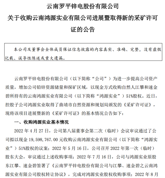 生产规模3万吨/年!罗平锌电控股子公司取得罗平县弘安铅锌矿采矿许可证