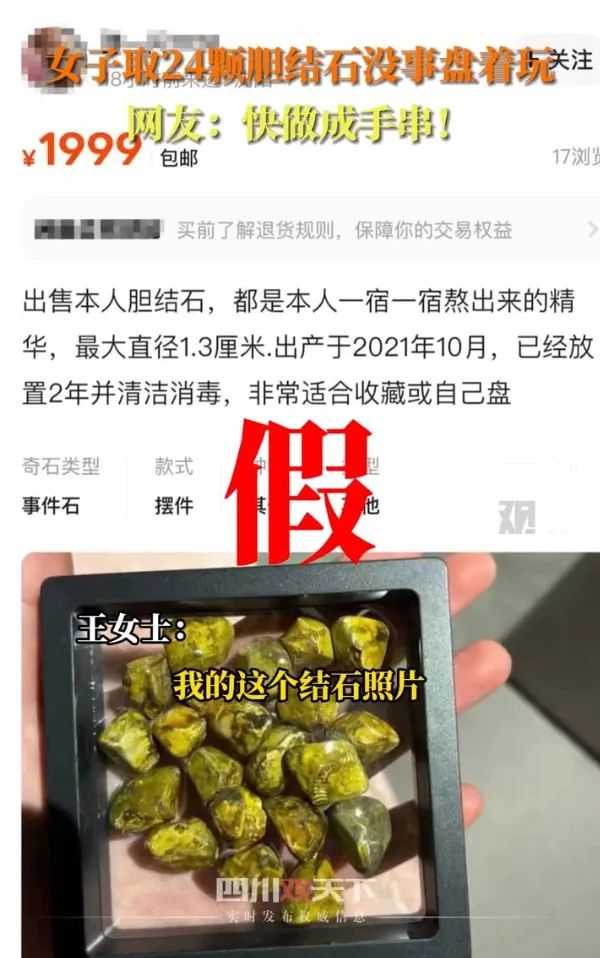近日,重庆。29岁王女士患“充满型胆结石”,手术取出24颗胆结石,1颗送检,丢掉2颗碎石留下21颗在手里盘着玩被围观。不少网友建议王女士做成手串,甚至有网友盗图售卖结石。王女士表示:自己的“炼丹炉”已经没有了,都是“孤品”所以不准备加工、卖掉。