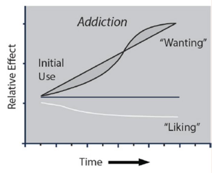 此外,2016年Berridge等人发表于《美国心理学家》的论文阐述了多巴胺在成瘾过程中的作用。“想要”(Wanting)和“喜欢”(Liking)是大脑中分开表征的两种信号,由不同的大脑系统介导,与多巴胺密切相关的是“想要”而不是“喜欢”,这就意味着多巴胺的过度反应会带来强烈的欲望,即过度的“想要”,“想要”远大于“喜欢”,最终形成成瘾行为。